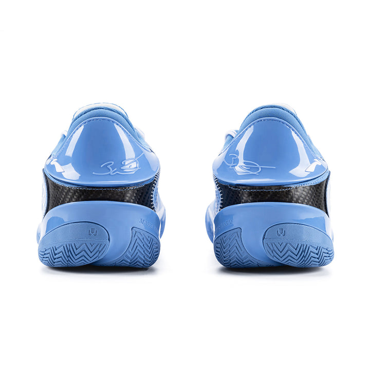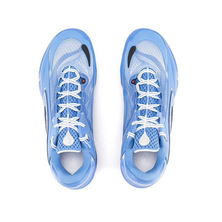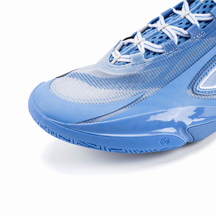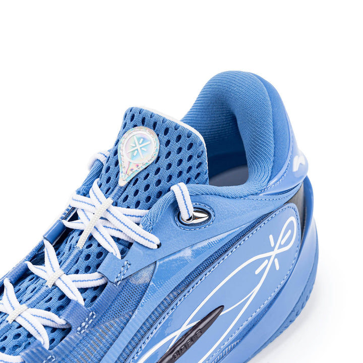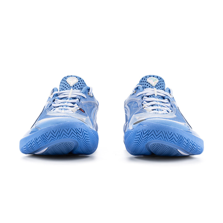 Das Obermaterial besteht aus einem Multi-Material-Patchwork, das ein exzellentes Umwickelgefühl und ein Spielfeldgefühl bietet, um explosive Bewegungen zu unterstützen. Die Schuhe sind mit einem sauberen Farbschema in Blau gestaltet.