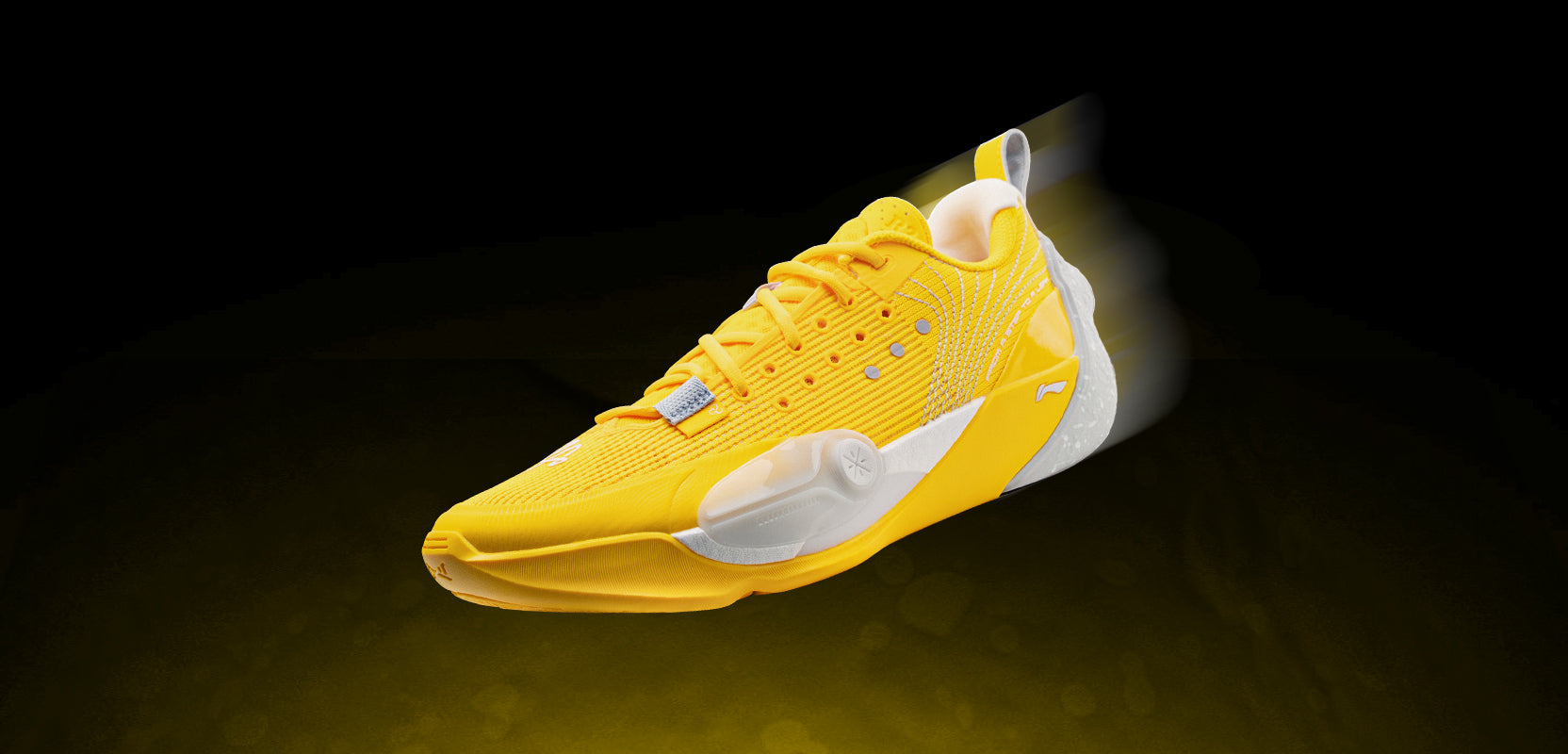 Das Design des Absatzes ist von Mondhöhlen inspiriert. Es ist in leuchtend Gelb gehalten und Dwyane Wades Unterschrift ist an der Ferse angebracht.