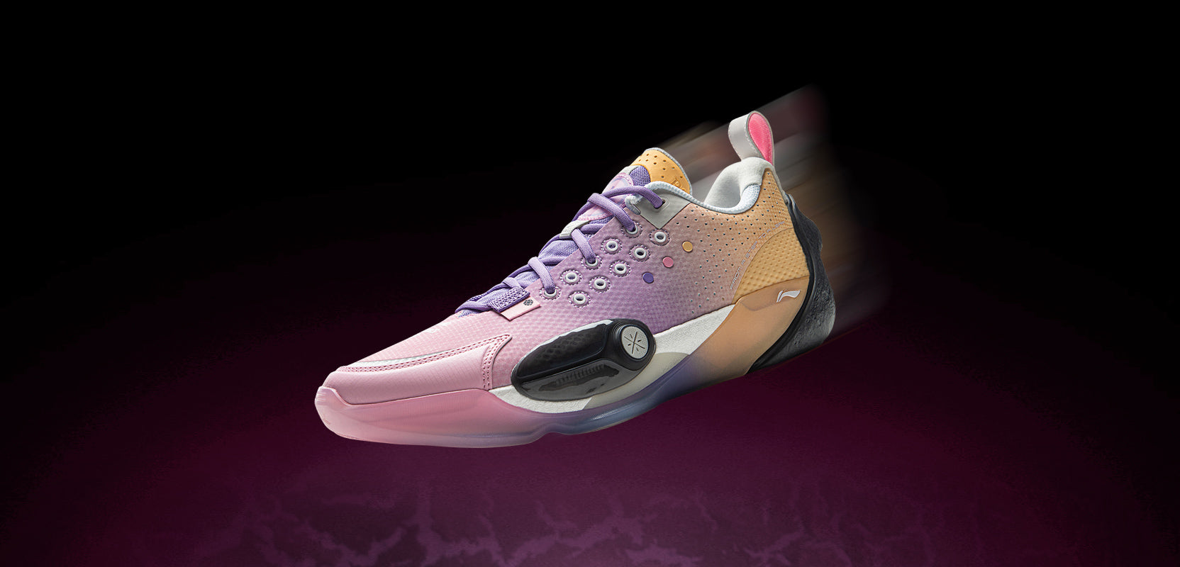 Das Design des Absatzes ist von Mondhöhlen inspiriert. Das Obermaterial weist einen fließenden Übergangseffekt von Rosa und Lila zu Gelb auf. Dwyane Wades Unterschrift ist an der Ferse angebracht.