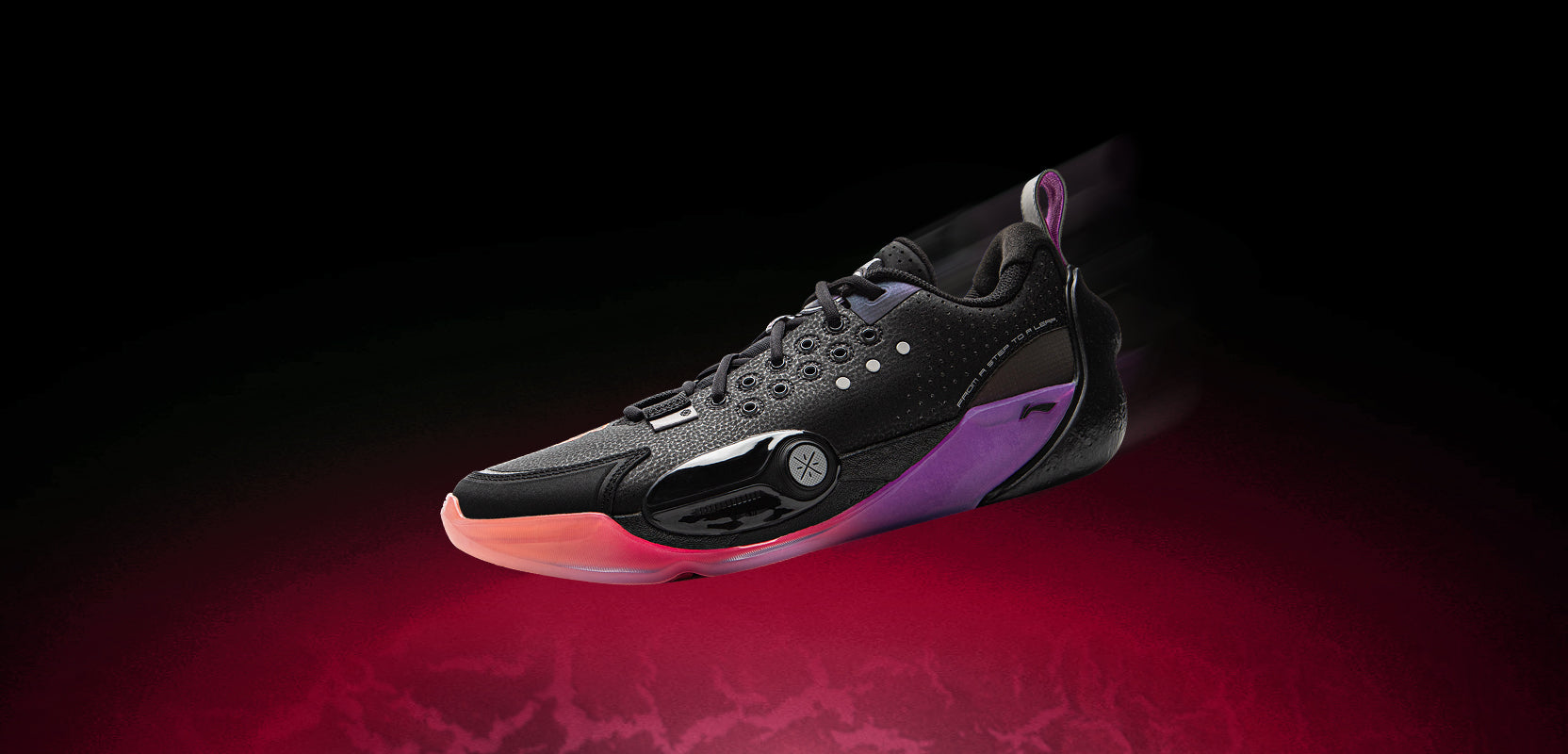 Das Design des Absatzes ist von Mondhöhlen inspiriert. Das Obermaterial ist in Schwarz und im Vorfußbereich ist rosa- bis violettfarbene Gummi-Außensohle. Dwyane Wades Unterschrift ist an der Ferse angebracht.