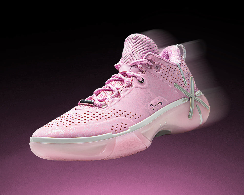 Das Obermaterial aus rosa Leder sorgt für eine bessere Textur. Am Hinterfuß befindet sich das Way of Wade-Markenlogo, und auf einer Seite des Obermaterials ist das Wort „Family“ (Familie) angebracht.